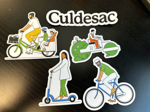 Whimsical Culdesac stickers for computers, water bottles, bikes, bike locks, wherever! Share on social so we can highlight you! @Liveculdesac